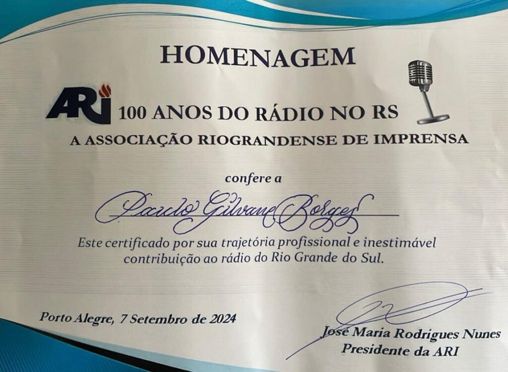 No dia 07 de abril, Paulo Gilvane Borges vai receber da Associação Riograndense de Imprensa (ARI) a medalha Alberto André como reconhecimento por sua trajetória profissional na comunicação